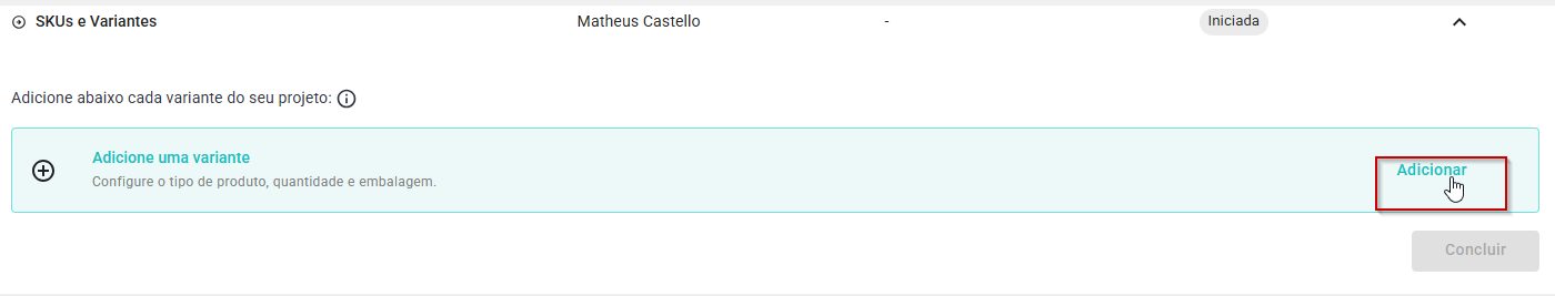 Para adicionar o SKU no projeto, a etapa de especificação precisa estar aberta.