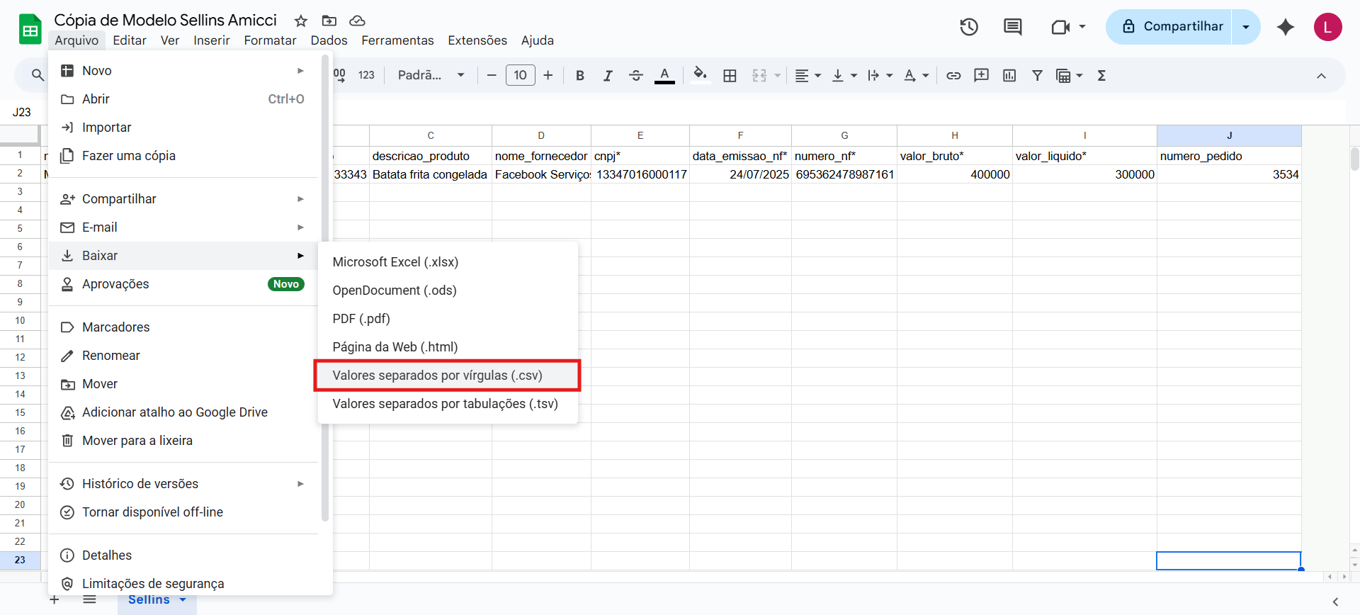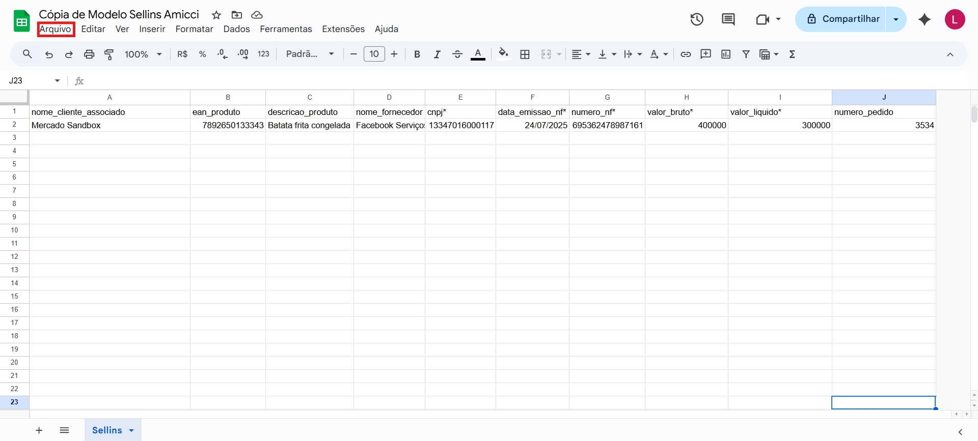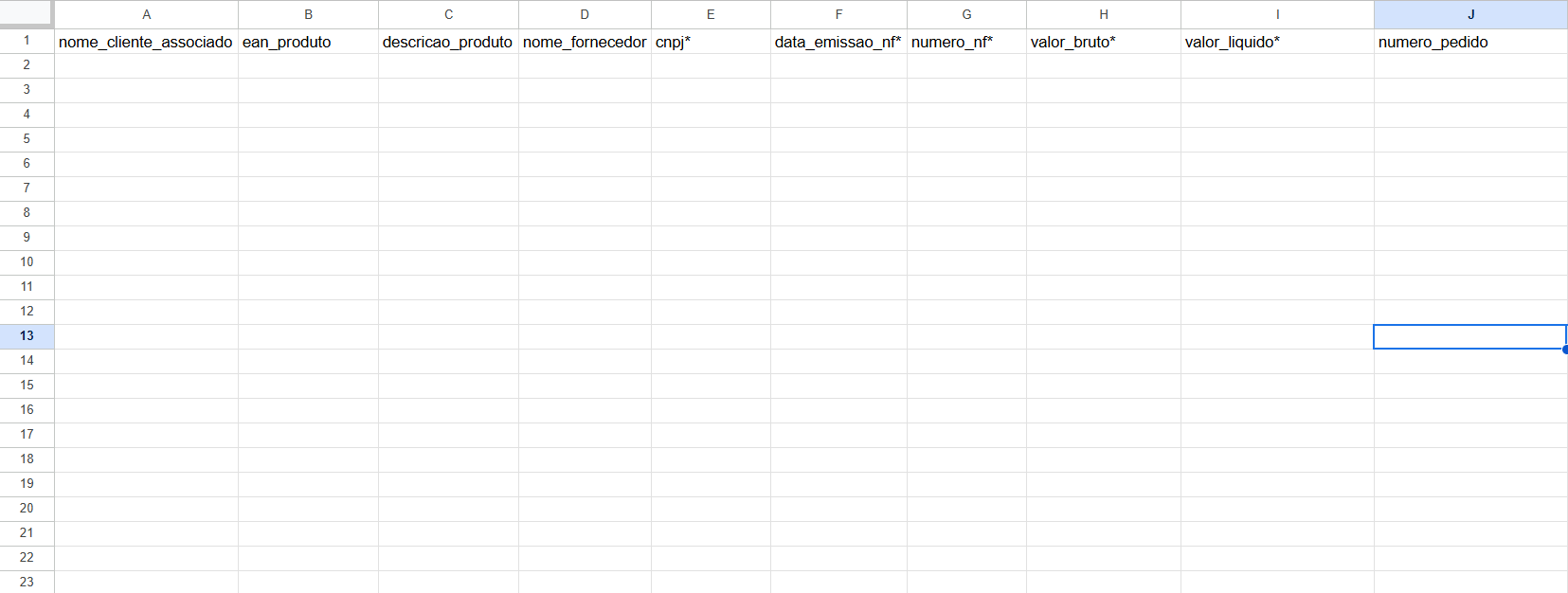 - Coluna I: valor_liquido* - O valor do produto após os descontos e deduções. NÃO UTILIZE PONTOS PARA SEPARAR AS CASAS DOS VALORES.