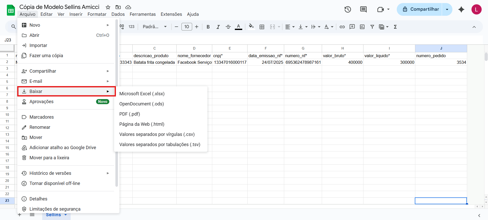 Havendo preenchido todas as colunas corretamente, agora você precisa baixar a sua cópia da planilha para poder subi-la à plataforma.