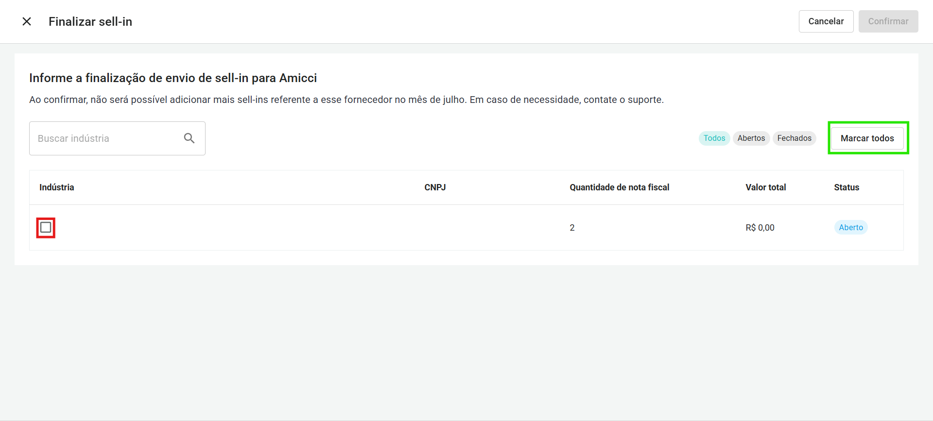 - Clicar no botão Marcar todos para selecionar todas as indústrias (quadrado verde).