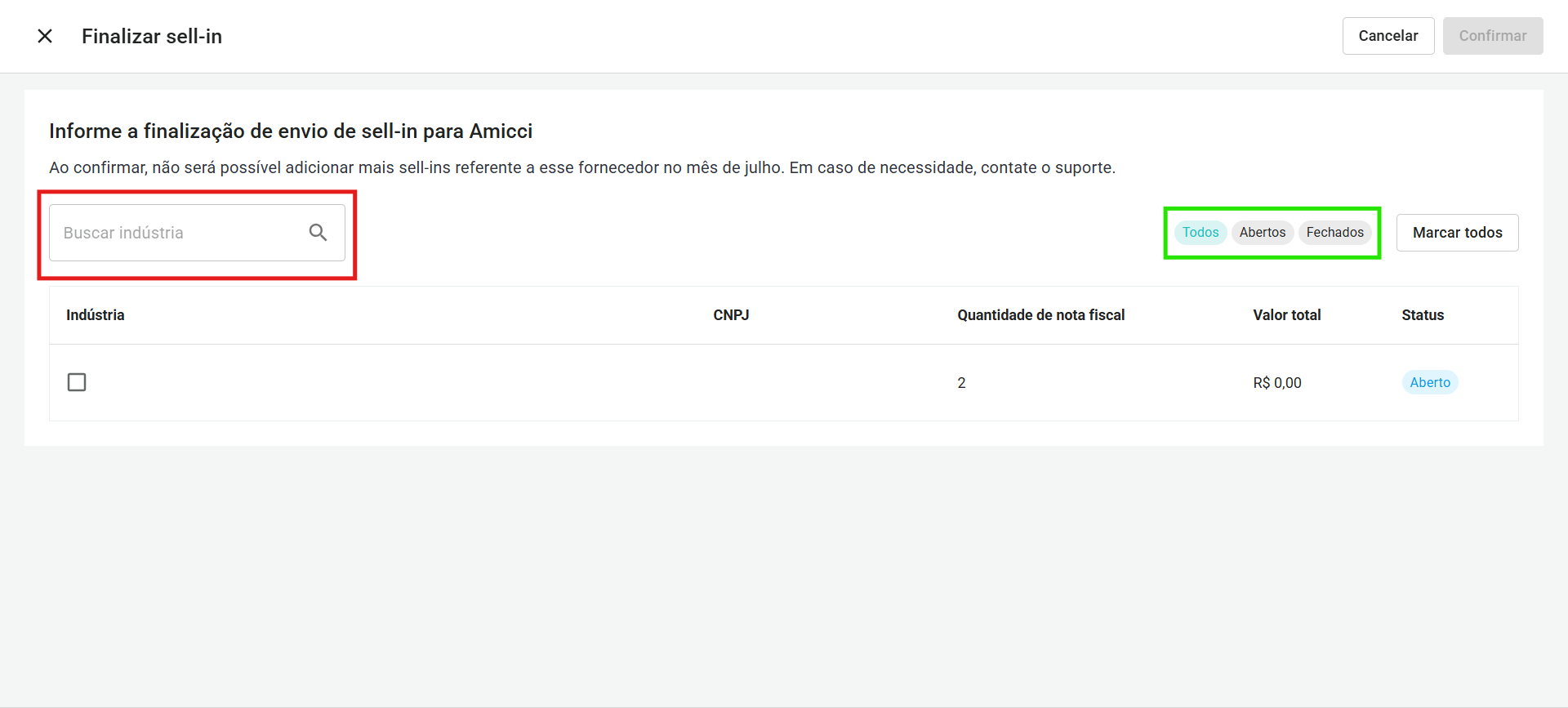 - Na página de finalização de Sell-in, você irá se deparar com uma lista com todas as indústrias com as quais você possui sell-ins em aberto. Para encontrar a indústria que você procura, você pode: