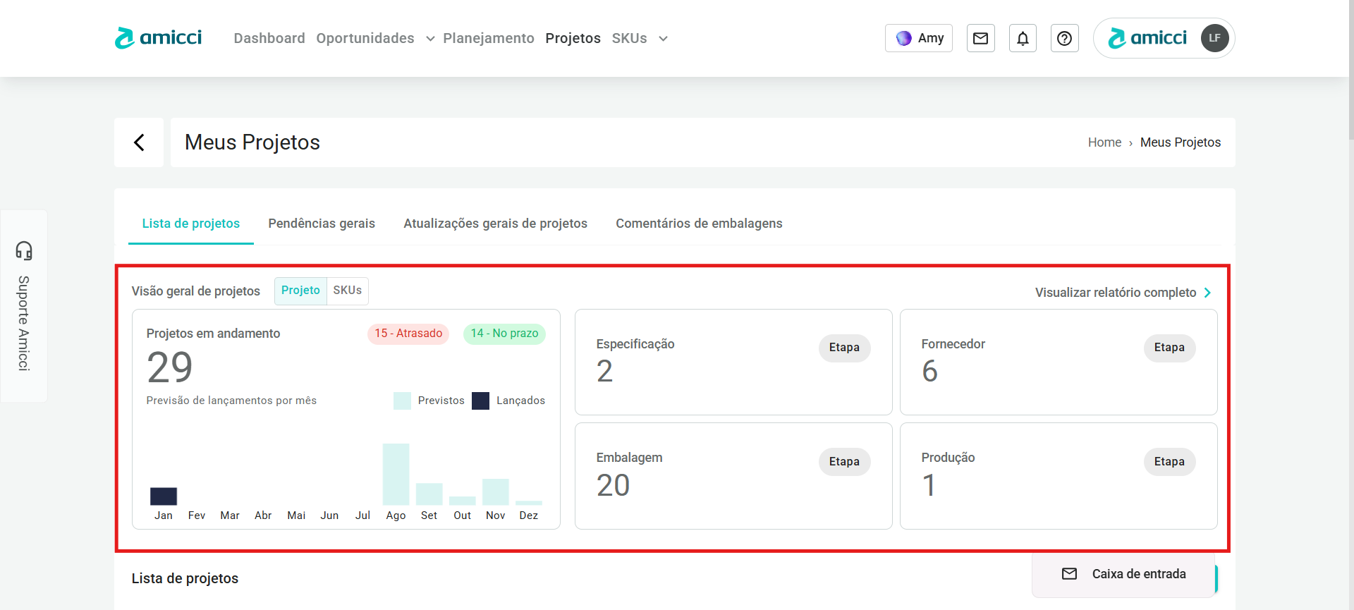 - O quadro maior mostra a quantidade de projetos em andamento, quantos deles estão atrasados e quantos estão no prazo, e um gráfico mostrando a previsão de lançamentos de projetos por mês. Os em escuro são os que já lançaram e em claro são os que ainda irão lançar.