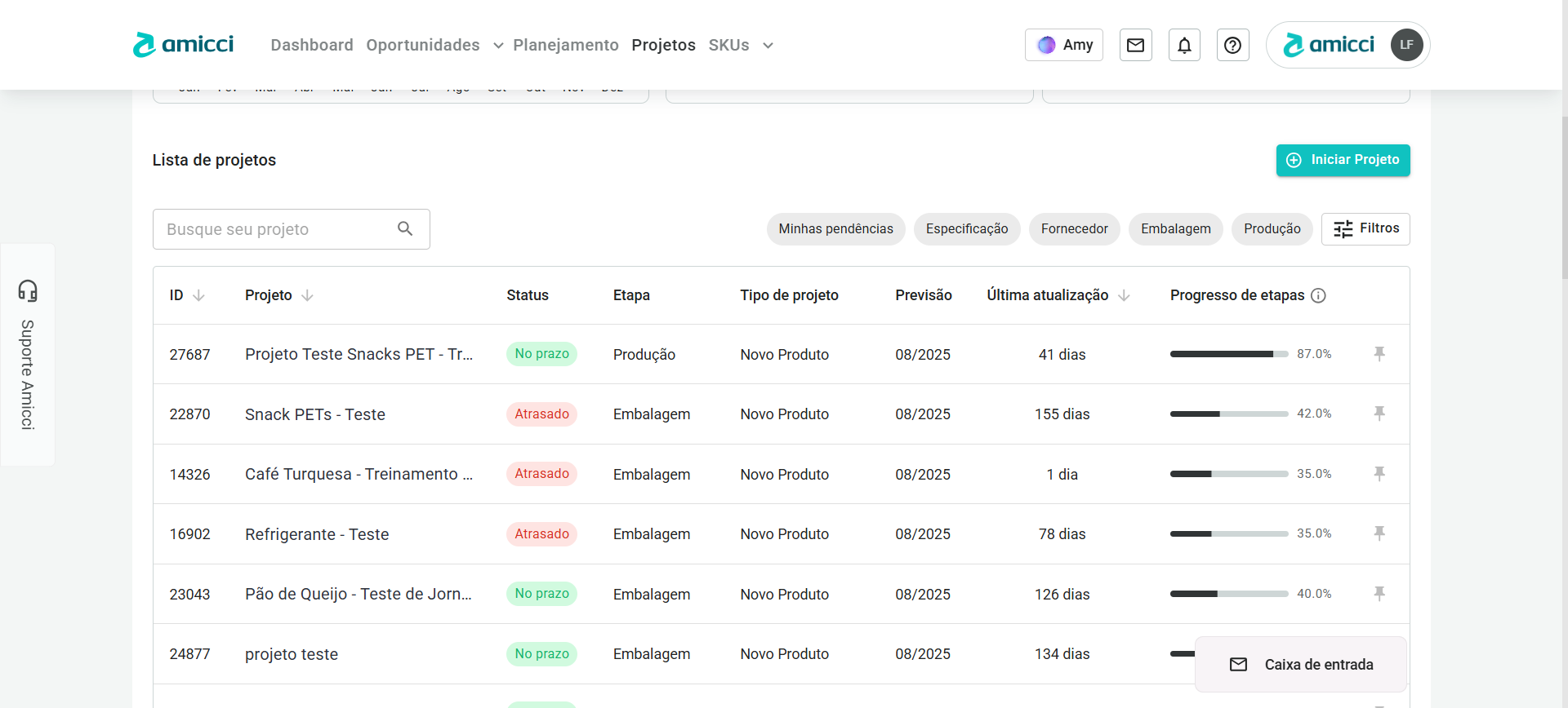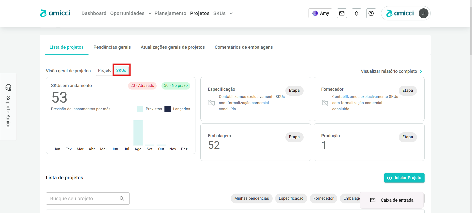 - Os quadros menores mostram quantos desses projetos em andamento se encontram em cada uma das macro-etapas dos projetos. Sendo elas: Especificação, Fornecedor, Embalagem e Produção.