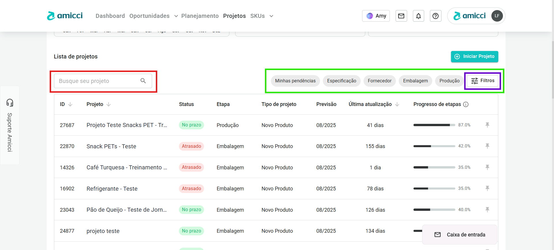 - No quadrado verde, temos uma lista de filtros. O primeiro filtra apenas os projetos que estão com pendências dependentes especificamente de você, e os demais filtram projetos que estão em macro-etapas específicas.