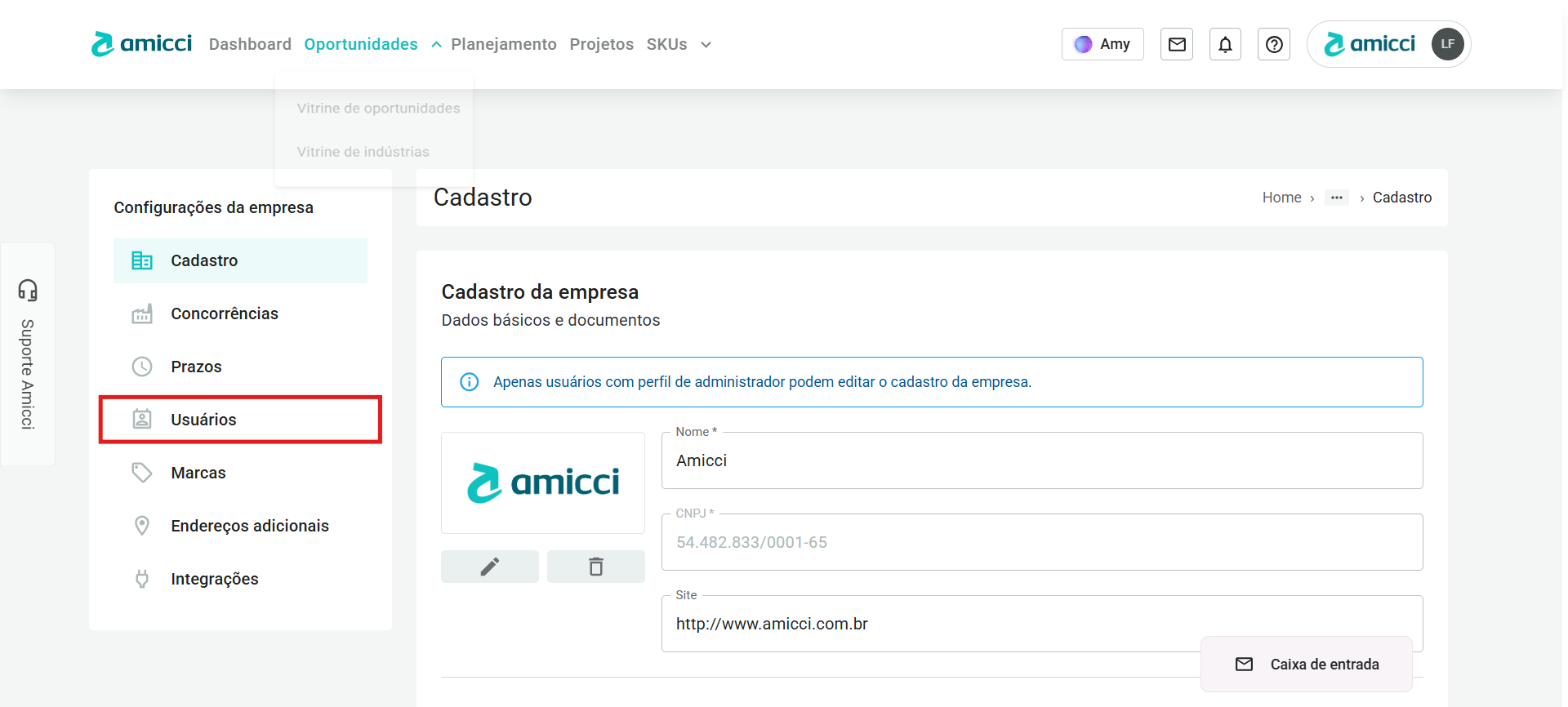 - Na página de Configurações da empresa, você deve clicar na aba Usuários.