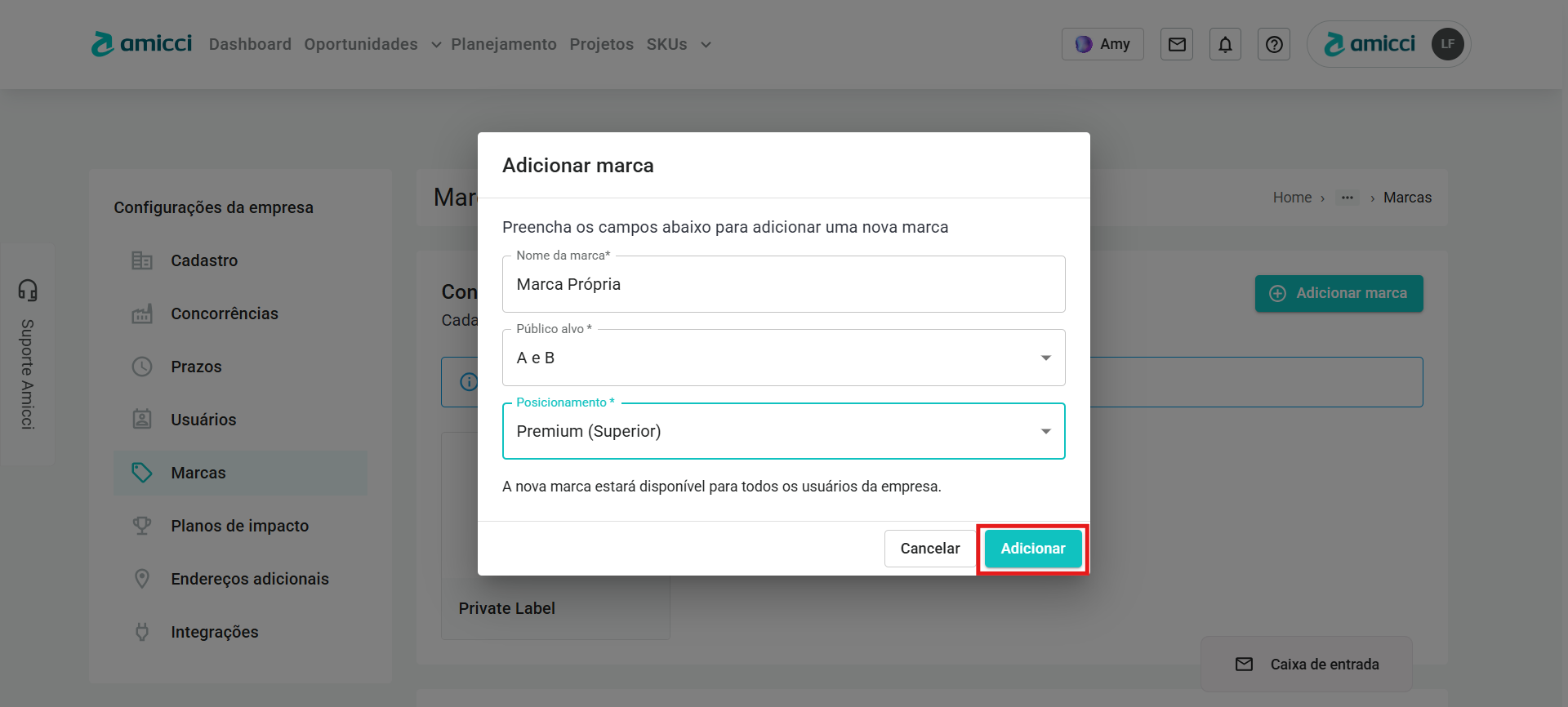 - Após preencher com as informações sobre a sua marca, você deve clicar no botão Adicionar.