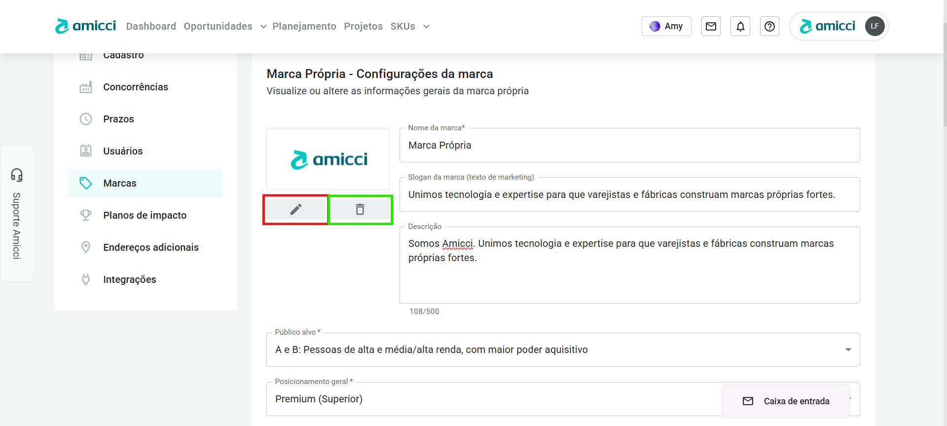 - Nessa página você pode editar as informações que você inseriu quando criou a marca, como nome, público alvo e posicionamento geral. Além dessas informações, você pode: