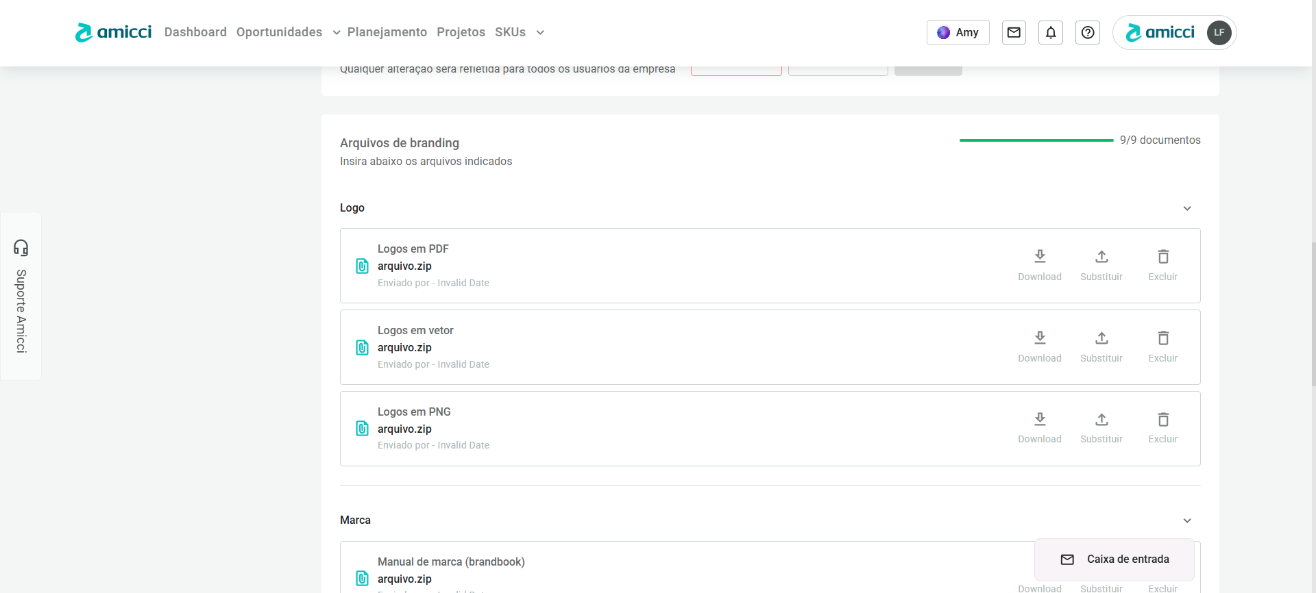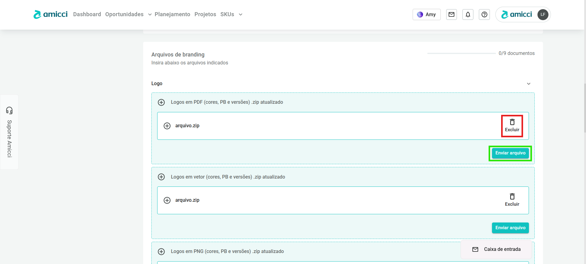 - IMPORTANTE: Apenas arquivos .zip são aceitos nos documentos do tipo Logo e tipo Marca. Apenas arquivos .pdf são aceitos nos documentos do tipo Agência de design.