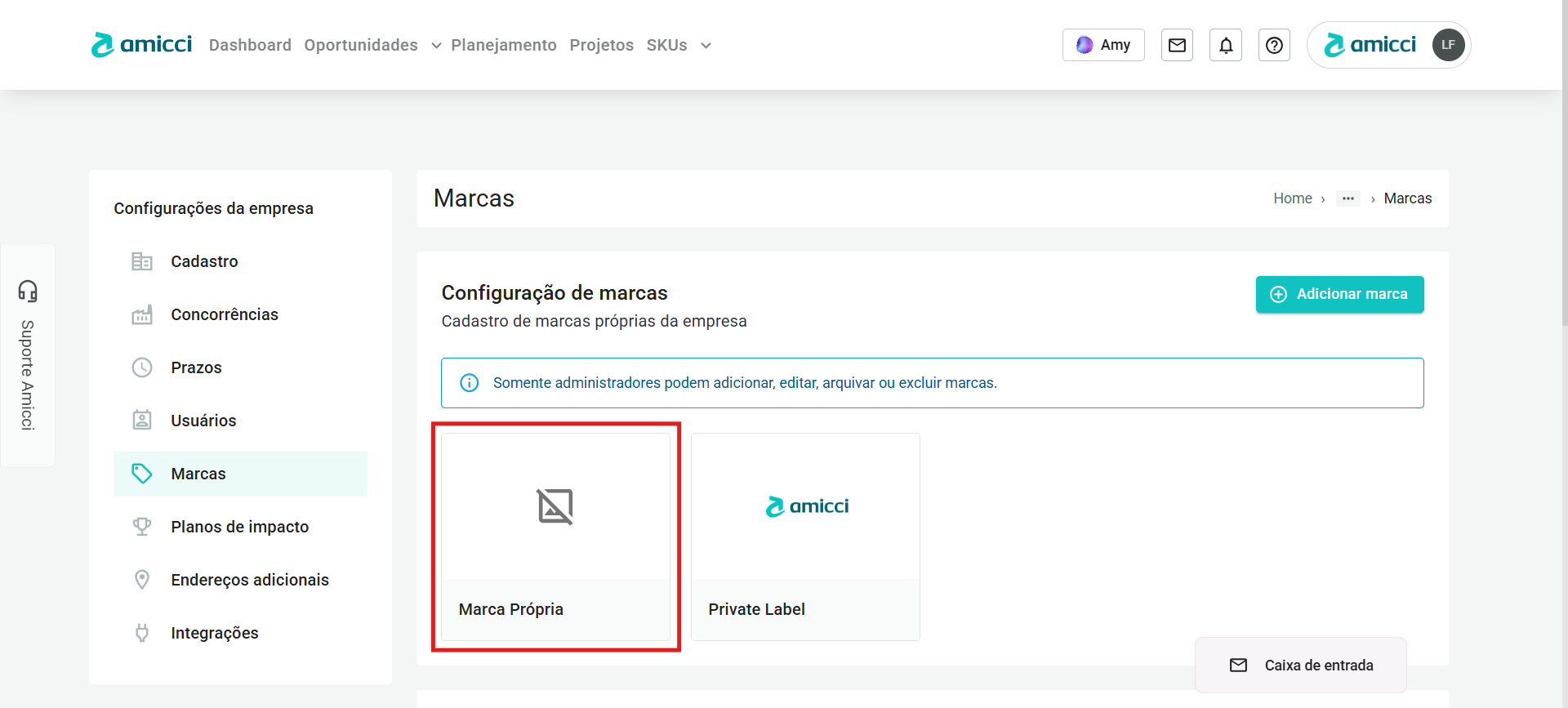 - Na página de Configurações da empresa, você deve clicar na aba Marcas.