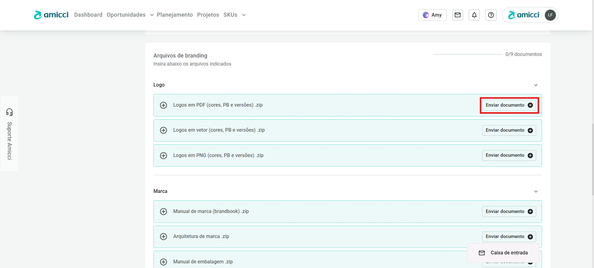 - Clientes: Pelo botão Suporte Amicci presente no canto esquerdo de todas as páginas da plataforma.